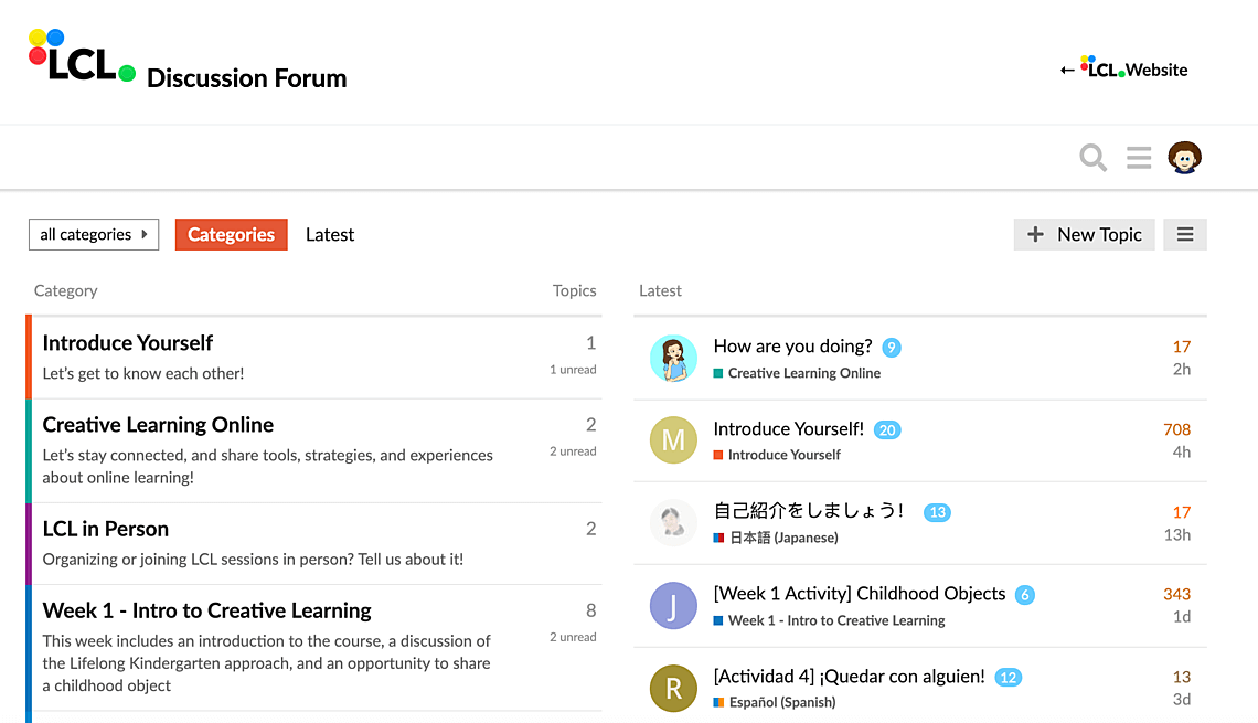 The discussion forum is the heart of the LCL community. During the course, participants use it to document their hands-on activities, to share their reflections on the weekly themes, and to engage in meaningful conversations with each other. The forum includes sections in many different languages.