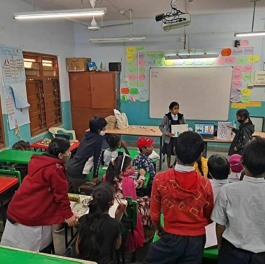 Today, our students Niharika and Arpita, under the guidance of our Teach For India Fellow Rukhmini Bhatia, took the initiative of leading a Saturday Art Class session focused on managing Actions and action words for their classmates!