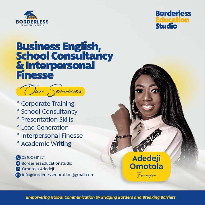 We make use of technology to reach out clients and learners. As the name implies,we are Borderless and as long as there is technology,we can reach as many learners as we wish to regardless of their location. Our classes hold on Google meet,zoom, telegram and watsapp. As a communication expert, communication is not only about talking and discussing the efficacy of communication is of utmost importance to a professional,leader and students. Through our personalized teachings and coaching,we embrace technology to reach out clients regardless of wherever they are,we have been able to col
