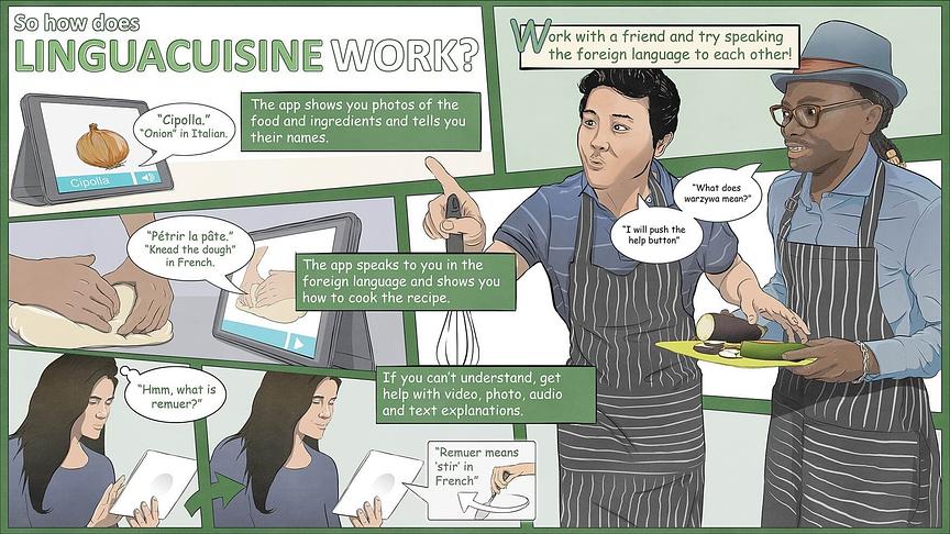 - The Linguacuisine app can be used for foreign language lessons, but also for cookery lessons and cross-curriculum projects. Students can use the app to cook and learn in the kitchen at home as well as at school. There is a prize for the best recipe!